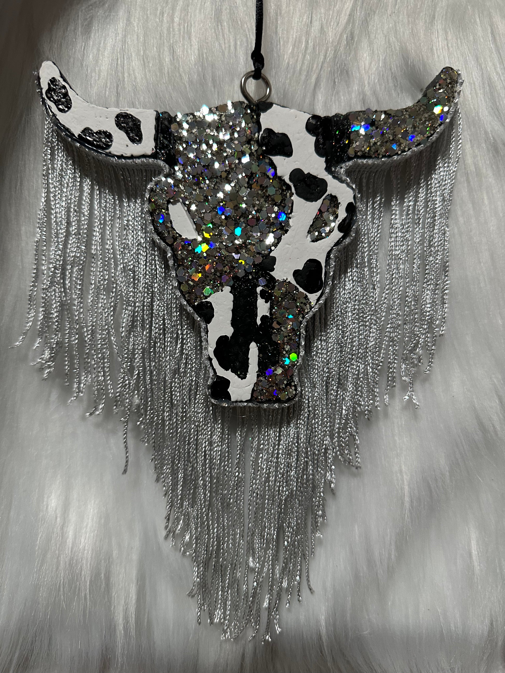 Car Freshie Cow printed Bull Skull with fringe to hang from your car and smell so good.